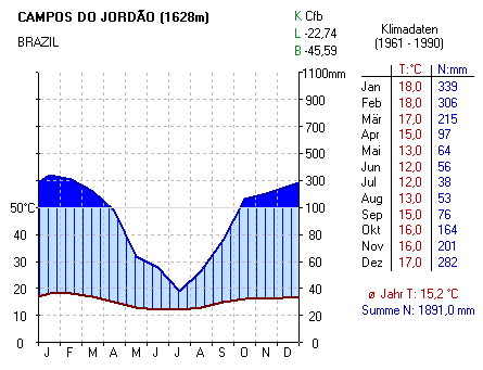 Campos do Jordão localiza-se a 1.700 metros de altitude e pesquisas científicas acusaram a superioridade de seu clima em relação a Davos Platz, nos Alpes Suiços, bem como um teor de oxigenação e ozona superior ao de Chamonix, famosa estância francesa, pela pureza do ar. Campos do Jordão apresenta vantagem sobre as demais estâncias climáticas brasileiras: o seu clima tropical de montanha faz com que o sol esteja presente praticamente o ano todo. A luminosidade costuma atingir o seu grau máximo no inverno, quando então a temperatura chega a 5 graus negativos, embora já tenha atingido, no passado, a 18 graus abaixo de 0, em 1992.