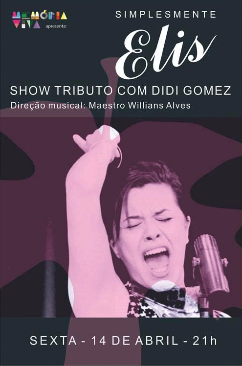 Show em tributo a Elis com Didi Gomez.Direção Musical: Maestro Willians AlvesIngresso Inteiro: 80,00Meio: 40,00Ingressos a venda no local e no posto shell capivari.Mais informações: (012) 99786-7719