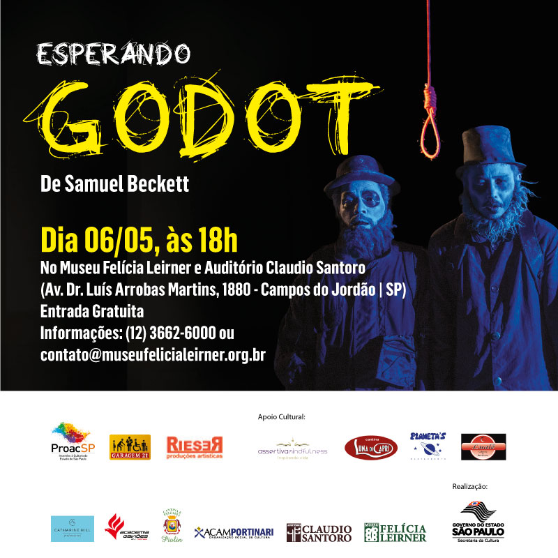 Com entrada gratuita, montagem é encenada pelo grupo Garagem 21 e apresenta história escrita em 1949, por Samuel Beckett, com adaptação com referências pop e da HQO Museu Felícia Leirner e Auditório Claudio Santoro, em Campos do Jordão - instituições da Secretaria da Cultura do Estado de São Paulo geridas pela ACAM Portinari - recebe, neste domingo, 6, a peça Esperando Godot. Encenada pelo grupo Garagem 21, a apresentação terá início às 18h00 e entrada gratuita.Escrita em 1949 pelo irlandês Samuel Beckett, a peça é ainda hoje considerada um marco na narrativa moderna. A história apresenta dois personagens que aguardam a chegada de Godot, que nunca aparece. Com direção de Cesar Ribeiro, nesta adaptação, a trupe usa a influência da estética de HQs e desenhos animados, além de referências ao pop com canções de The Trashmen, Kate Bush e The White Stripes.O Museu Felícia Leirner e Auditório Claudio Santoro estão localizados à avenida Dr. Luis Arrobas Martins, 1.880. O telefone para informações é (12) 3662-6000. O horário de funcionamento é das 9h00 às 18h00. A entrada é de R$10,00 (inteira) e R$5,00 (meia - estudante e idoso) e gratuita aos domingos. Conheça nossa política de gratuidade no www.museufelicialeirner.org.br/expediente-e-ingresso.Serviço:Peça Esperando Godot Data: 06/05/2018 (domingo)Local: Museu Felícia Leirner - Auditório Claudio Santoro (Av. Dr. Luis Arrobas Martins, nº 1.880, Alto da Boa Vista – Campos do Jordão/SP)Horário: às 18h00Entrada: gratuitaClassificação etária: 12 anos
