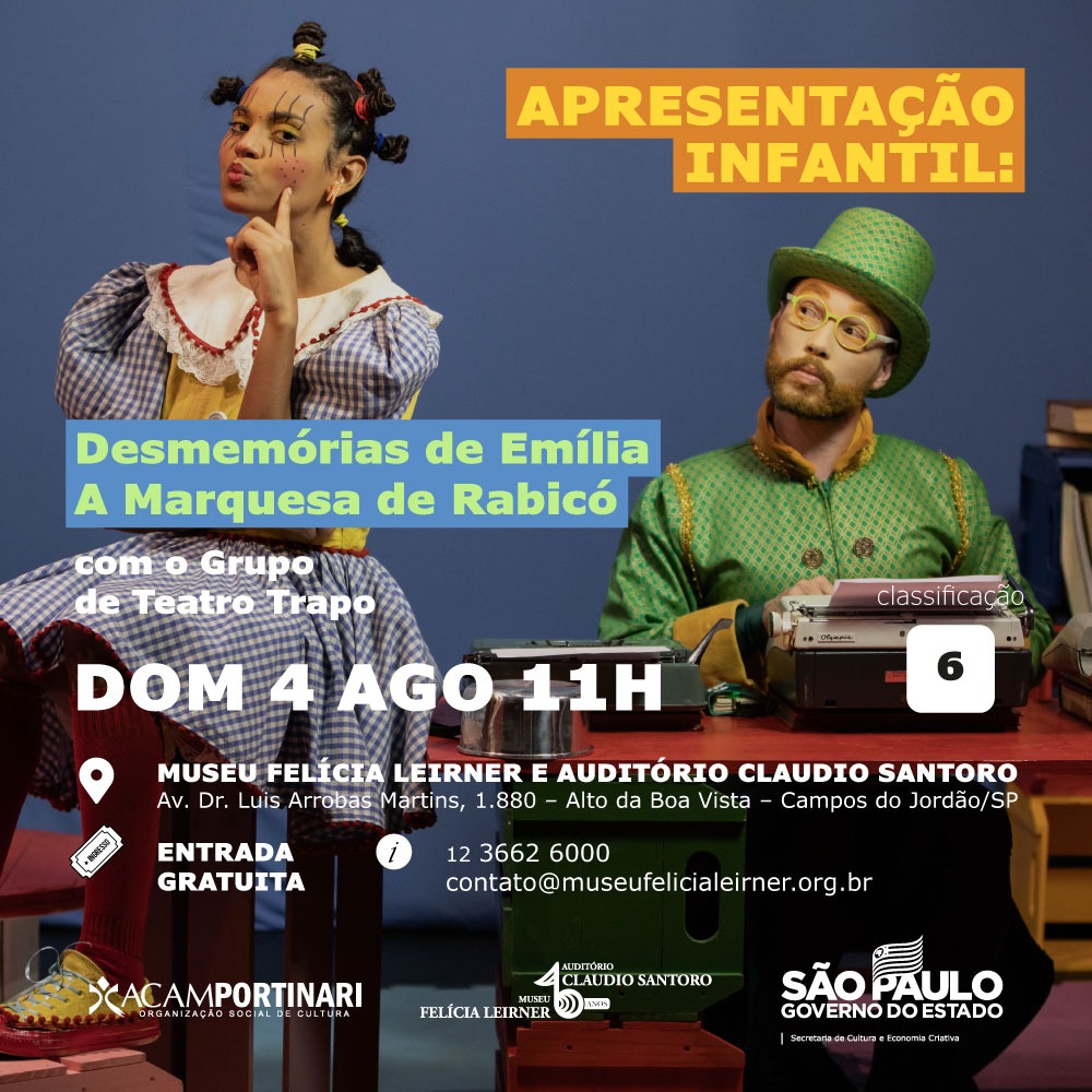 Museu e Auditório recebem o teatro infantil “Desmemórias de Emília – A Marquesa de Rabicó”, do Grupo de Teatro Trapo. A boneca mais famosa do mundo da literatura infanto-juvenil resolveu escrever suas “des-memórias”, que, segundo ela, são memórias com “meias verdades inteiras”, ou seja, contadas do seu jeitinho. Para tal missão, ela tem a ajuda de seu amigo inseparável: o sábio Visconde de Sabugosa, além de Pedrinho, Dona Carochinha, o Príncipe Escamado e até mesmo a Cuca, que ajudam Emília na missão de compartilhar suas desmemórias para o mundo, com direito a dedicatórias e festa de lançamento. Um espetáculo livre para toda a família!Grupo Trapo é uma iniciativa teatral da cidade de São Paulo, criado em 2000 pelo ator e diretor Muriel Vitória. Desenvolve trabalhos baseados em comportamentos humanos e cultura popular, utilizando como expressão e estética os elementos corporais pautados no Teatro de Investigação Corporal.Local: Museu Felícia Leirner - Auditório Claudio Santoro (Av. Dr. Luis Arrobas Martins, 1.880 – Alto da Boa Vista – Campos do Jordão/SP)Horário: domingo, das 11h às 11h40Informações: (12) 3662-6000Entrada: gratuitaClassificação: 6 anos#SejaSolidário – os visitantes poderão contribuir com a Campanha do Agasalho 2019, doando cobertores e agasalhos em bom estado de conservação
