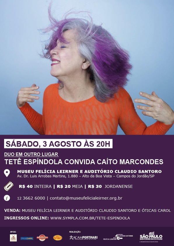 O Museu Felícia Leirner e Auditório Claudio Santoro recebem o show “Duo em Outro Lugar”, de Tetê Espíndola. Munida de sua craviola, em uma versão enxuta e ousada, a cantora e compositora “que tem Pássaros na Garganta” convida para lhe acompanhar o renomado percussionista Caíto Marcondes. O músico com sua impecável coleção de tablas, bodhram, hang, cria uma exuberante atmosfera rítmica e timbrística. Versátil, enriquece a dinâmica do espetáculo, executando em algumas faixas especiais, a guitarra e a escaleta. No repertório, além de músicas do novo CD, Tetê resgata grandes clássicos brasileiros como Quiquiô (Geraldo Espíndola) e carinhoso (Pixinguinha).“Outro Lugar” é título do recente CD lançado pela artista, que apresenta composições inéditas com parceiros especiais, e de longa data, como Arrigo Barnabé, Marta Catunda, Bené Fonteles, o imortal poeta pantaneiro Manoel de Barros (em poema musicado pela cantora) e Arnaldo Black, autor da música título. Arranjos de puro encantamento produziram um som instigante de estranhezas e belezas, imaginados por Tetê em toda sua multiplicidade, para nos levar a “outro lugar”.Local: Museu Felícia Leirner - Auditório Claudio Santoro (Av. Dr. Luis Arrobas Martins, 1.880 – Alto da Boa Vista – Campos do Jordão/SP)Horário: sábado, das 20h às 21h15Informações: (12) 3662-6000Ingresso: Inteira R$ 40,00, Meia R$ 20,00 e Jordanense R$ 30,00 Ponto de Venda em Campos do Jordão: Museu Felícia Leirner - Auditório Claudio Santoro (Av. Dr. Luis Arrobas Martins, 1.880 – Alto da Boa Vista – Campos do Jordão/SP) | Óticas Carol (Av. Dr. Januário Miraglia, 890 - loja 02)