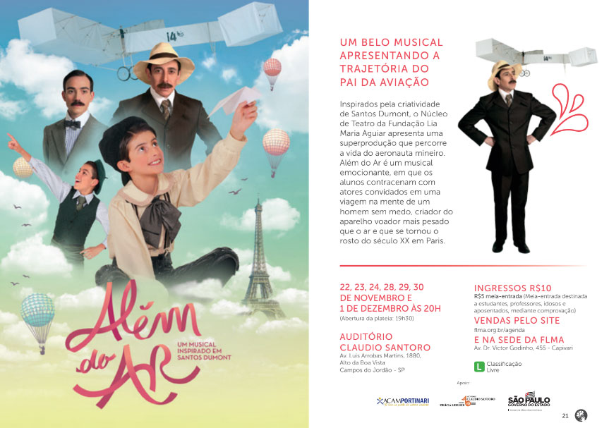 Inspirados pela criatividade de Santos Dumont, o Núcleo de Teatro da Fundação Lia Maria Aguiar apresenta nos dias 22, 23, 24, 28, 29 e 30 de novembro e 01 de dezembro uma superprodução que percorre a vida do aeronauta mineiro. Além do Ar é um musical emocionante, em que os alunos contracenam com atores convidados em uma viagem na mente de um homem sem medo, criador do aparelho voador mais pesado que o ar e que se tornou o rosto do século XX em Paris.Hora: 20hLocal: Auditório Claudio SantoroIngresso: R$10 (Meia-Entrada R$5)Vendas pelo site: https://www.flma.org.br ou na sede: Fundação Lia Maria Aguiar