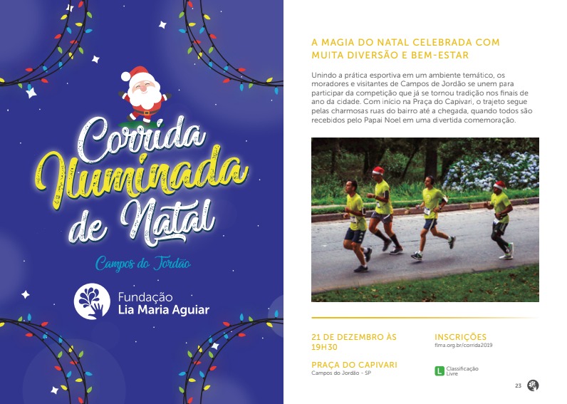 Unindo a prática esportiva em um ambiente temático, os moradores e visitantes de Campos de Jordão se unem para participar da competição que já se tornou tradição nos finais de ano da cidade. Com início na Praça do Capivari, o trajeto da Corrida Iluminada de Natal segue pelas charmosas ruas do bairro até a chegada, quando todos são recebidos pelo Papai Noel em uma divertida comemoração. Neste ano o evento contará com uma novidade. Além das categorias adultos e infantil, terá também a Cãorrida, uma prova para para participar com seu amigo pet. Veja as modalidades com os horários da largadas: