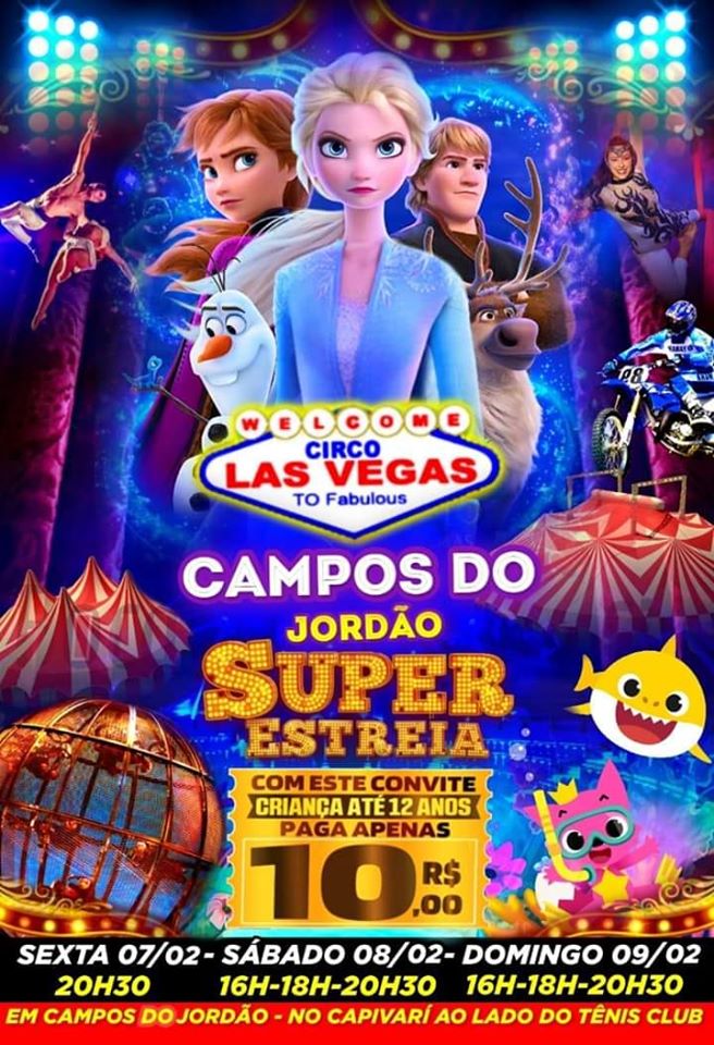 Os jordanenses e turistas brasileiros que visitarem o Campos do Jordão (SP) recebem nesta sexta-feira (7), para uma curta temporada o Circo Las Vegas. A estreia acontece 20h30. Segundo a direção do circo, que volta a cidade após a dois anos, o público vai poder assistir um moderno espetáculo com artistas nacionais e internacionais, palhaços, super heróis, números aéreos com tecidos, truques de mágica, manobras arriscadas dos trapezistas, o emocionante Globo da Morte e mais super shows, entre eles Baby Shark e Frozem.As apresentações acontecem sempre de terça a domingo com início às 20h30, e aos sábados, domingos e feriados, também em duas outras sessões, às 16h e às 18h. Os ingressos com o print da tela da página do circo no Facebook custam R$ 10,00. Na venda de ingressos na bilheteria o Circo adota a política da meia-entrada para idosos, estudantes, menores de 12 anos e professores. Crianças de até dois anos não pagam.
