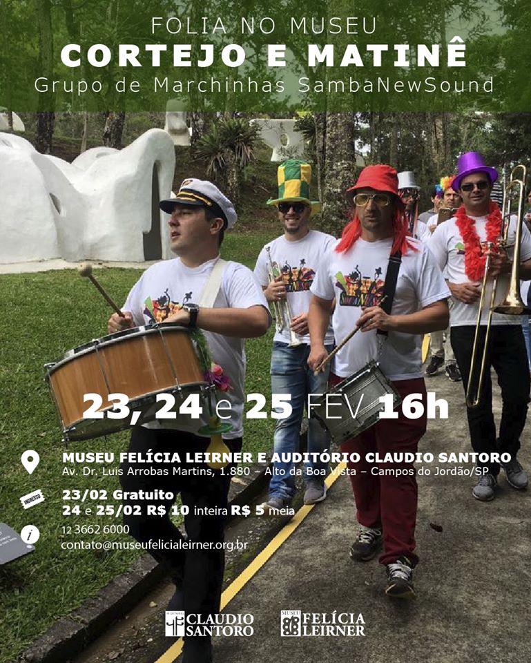 E aí, já escolheu a sua fantasia?! Na matinê de Carnaval, o Museu Felícia Leirner e Auditório Claudio Santoro receberão o Grupo de Marchinhas SambaNewSound, de Campos do Jordão. Os músicos farão um cortejo pelo museu, até à Concha Acústica, animando os visitantes com trompetes, trombone, bumbo, bateria, teclado e vocal, além de interpretar sucessos dos carnavais de rua como “Allah-Lá-Ô”, de Haroldo Lobo-Nássara, “Abre Alas”, de Chiquinha Gonzaga e “Mamãe Eu Quero”, de Jararaca-Vicente Paiva. Durante as apresentações o público será convidado a confeccionar suas máscaras para cair na folia junto à equipe de educadores. Venha pular com a gente!Dias: Domingo, Segunda e Terça, 23, 24 e 25 de Fevereiro de 2020
