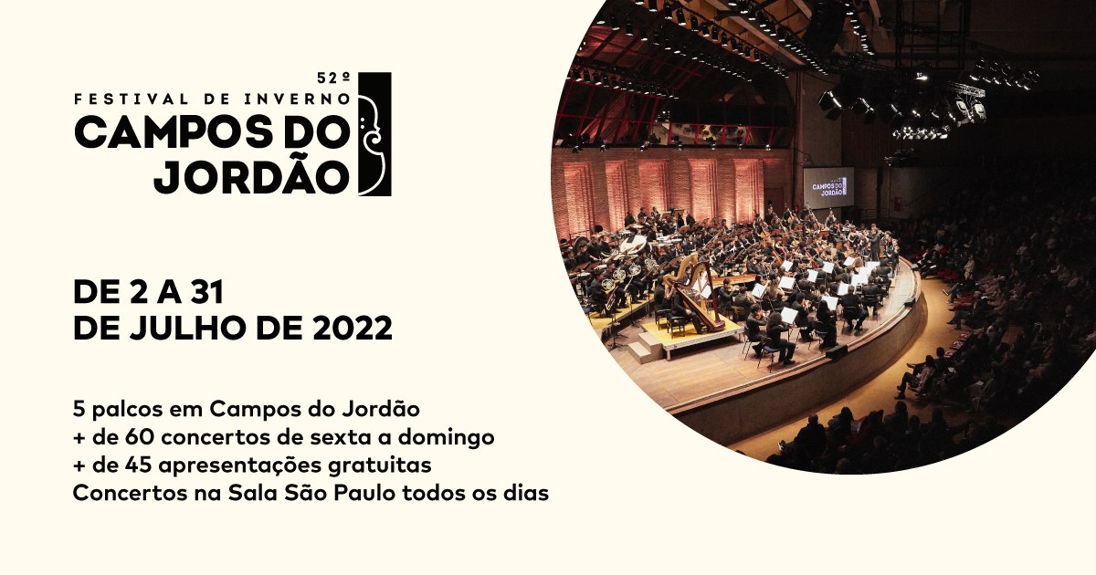 O Festival de Inverno de Campos do Jordão, reconhecido como o maior e mais tradicional evento de música clássica da América Latina, chega à sua 52ª edição em 2022. A programação artística e pedagógica acontece de 02 a 31 de julho e estará dividida entre as cidades de Campos do Jordão e São Paulo. O Festival de Campos do Jordão é promovido pela Fundação Osesp, pela Prefeitura de Campos do Jordão e pelo Governo do Estado de São Paulo, por meio da Secretaria de Cultura e Economia Criativa do Estado.Serão ao todo 84 concertos, sendo 90% deles gratuitos, em quatro locais espalhados por Campos do Jordão: o tradicional Auditório Claudio Santoro, no Parque Felicia Leirner (apresentações de sexta a domingo); o recém-inaugurado Parque Capivari (sábados e domingos); o Palácio Boa Vista, com concertos na Capela de São Pedro e em um palco externo (sábados e domingos); e a histórica Igreja de Santa Teresinha, no Centro da cidade (sextas-feiras).CORAL PAULISTANO