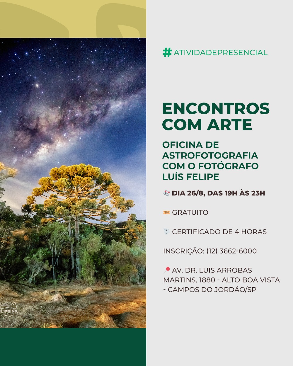 Dia 26 de agosto, das 19h às 23h, o fotógrafo Luís Felipe ministrará uma oficina de astrofotografia no Museu e Auditório