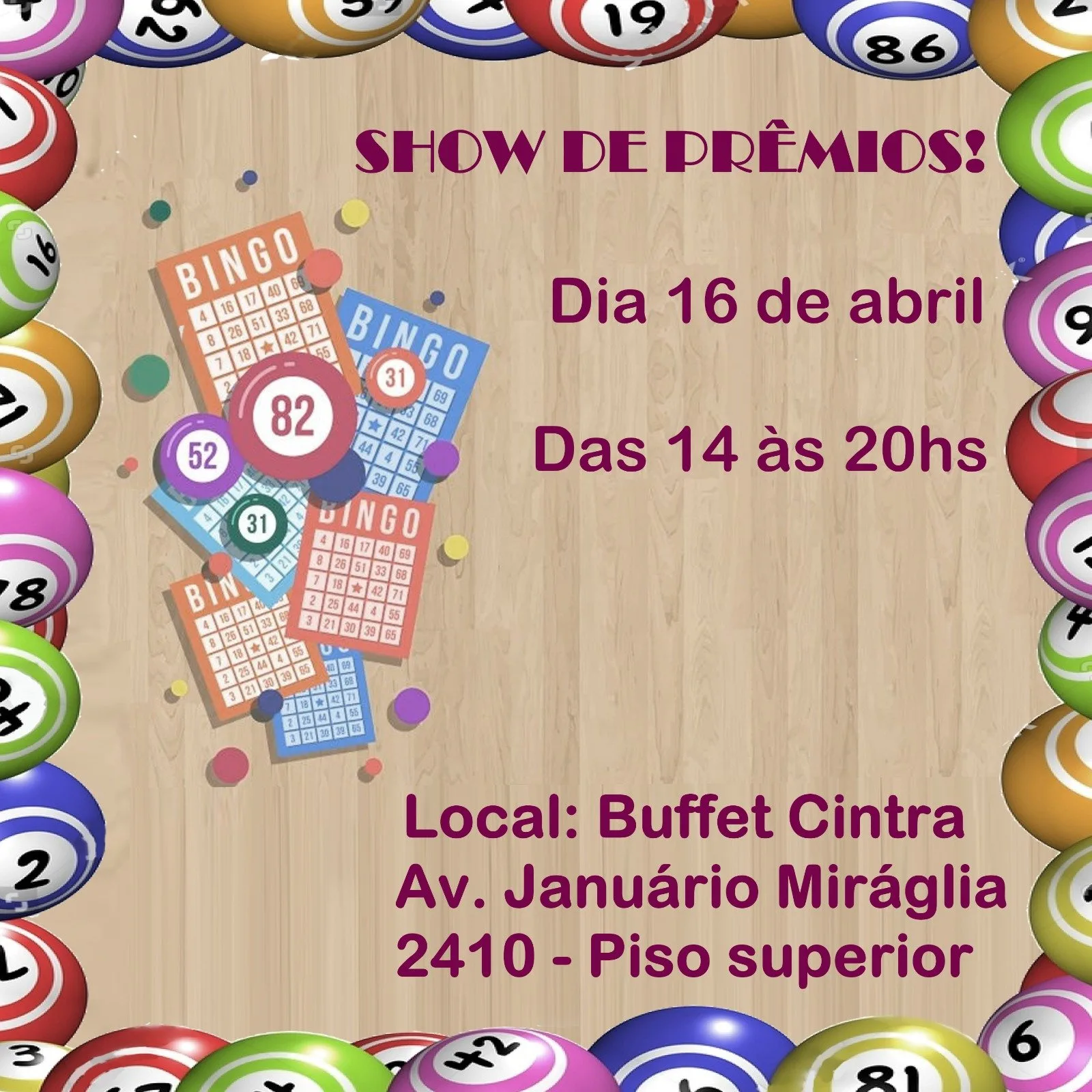 VAI TER SHOW DE PRÊMIOS você que gosta de bingo, já anota aí em sua agenda que no dia 16 de abril, das 14h às 20h teremos "Show de Prêmios"
