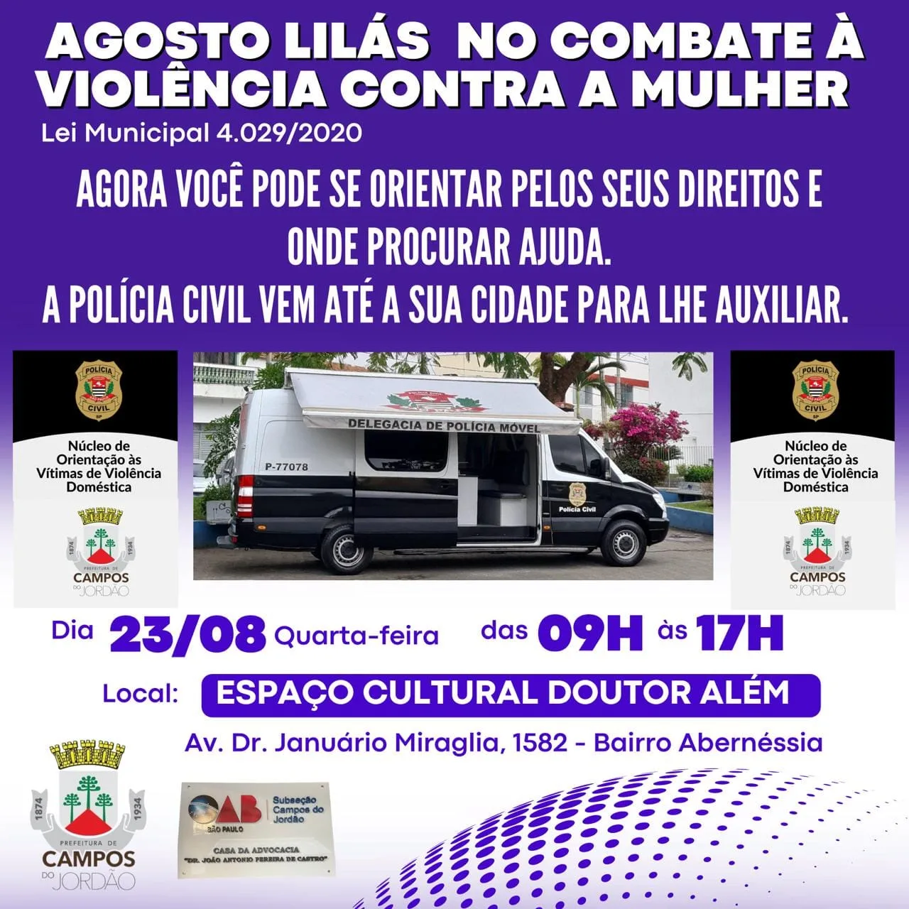 A Prefeitura de Campos do Jordão promove ao longo deste mês o Agosto Lilás - Campanha de Conscientização sobre a Violência Doméstica contra a Mulher. As atividades coincidem com a celebração dos 17 anos da Lei Maria da Penha (Lei 11.340/06), considerada legislação de referência em todo o mundo no combate a esse tipo de violência.