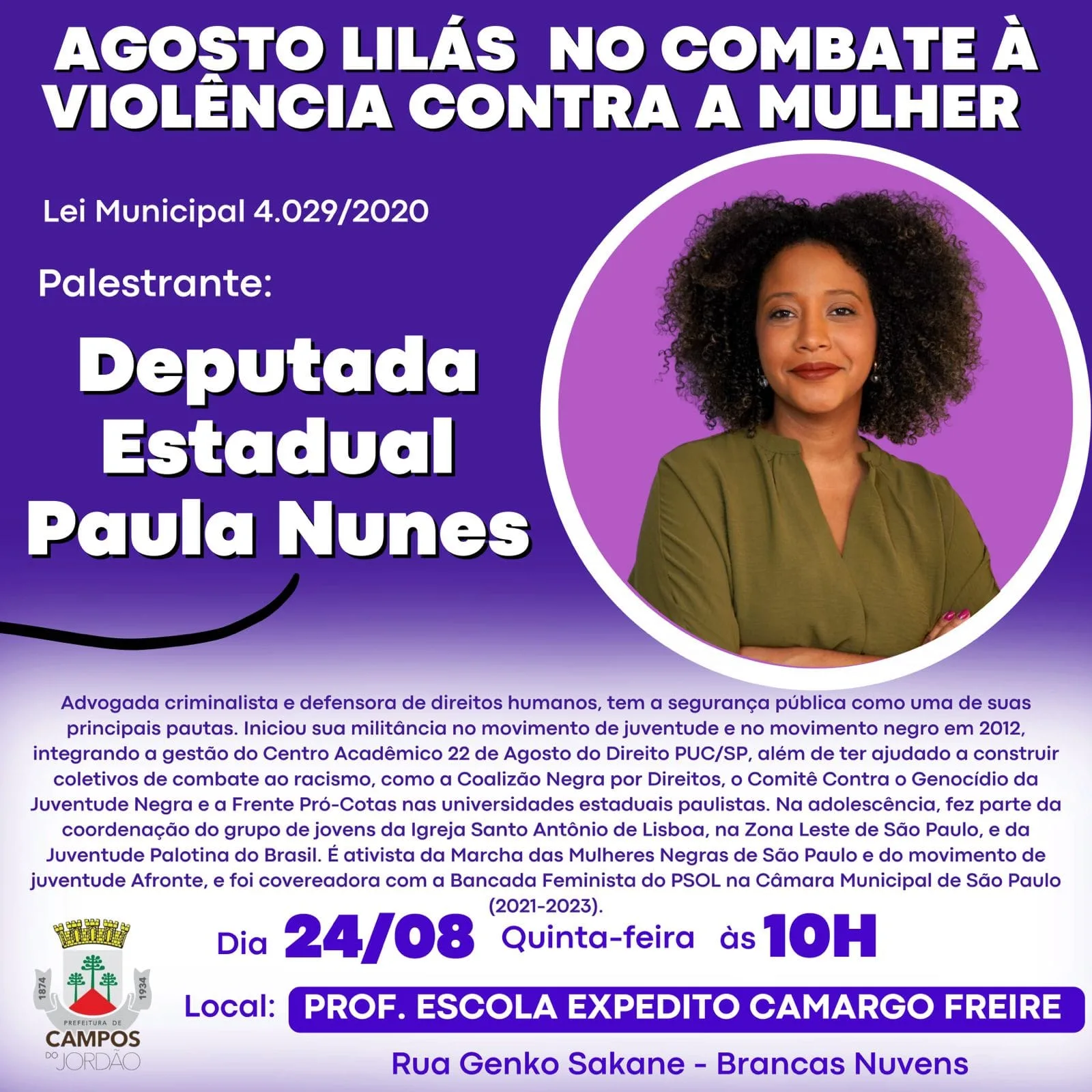 A Prefeitura de Campos do Jordão promove ao longo deste mês o Agosto Lilás - Campanha de Conscientização sobre a Violência Doméstica contra a Mulher. As atividades coincidem com a celebração dos 17 anos da Lei Maria da Penha (Lei 11.340/06), considerada legislação de referência em todo o mundo no combate a esse tipo de violência.