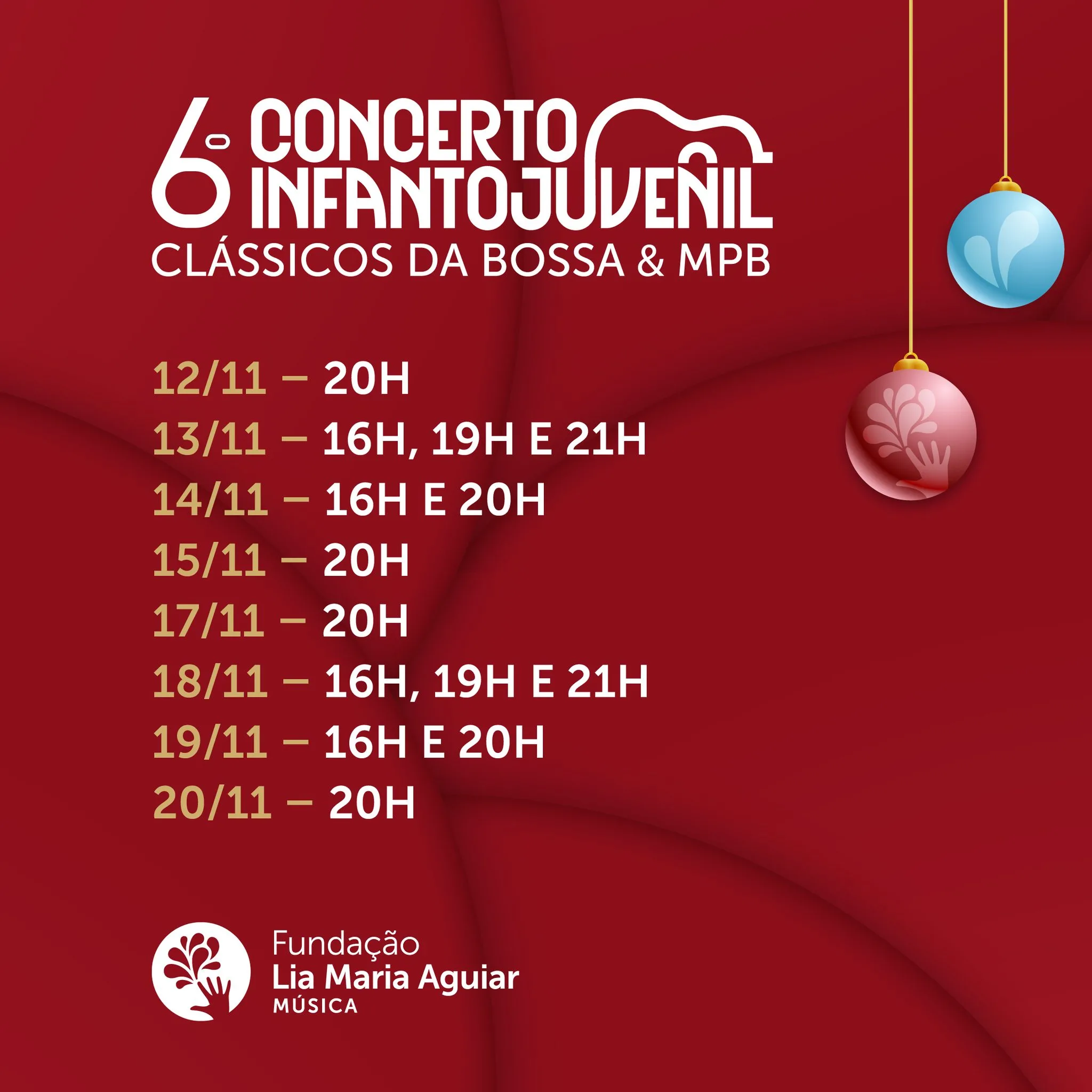 O espetáculo “6º Concerto Infantojuvenil – Clássicos da Bossa e MPB” irá trazer o melhor da música brasileira ao palco do Parque Capivari, homenageando grandes compositores, como João Gilberto, Tom Jobim e Cartola. O espetáculo mistura a nostalgia e a energia contagiante das canções nacionais às emocionantes interpretações dos alunos da FLMA, passeando também entre ritmos como maracatu, frevo e baião. As apresentações do Núcleo de Música acontecem de 12 a 15 e de 17 a 20 de novembro. 6º Concerto Infantojuvenil – Clássicos da Bossa e MPB Espetáculo Núcleo de Música FLMA