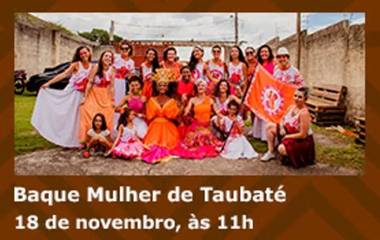 O Baque Mulher é um movimento de empoderamento feminino através do Maracatu de Baque Virado idealizado e coordenado por Joana D’arc Cavalcante – Mestra Joana. O Baque Mulher Recife foi fundado em 2008 e tem 39 filiais espalhadas pelo Brasil e uma em Portugal. Nas suas loas, além da homenagem à origem tradicional do Maracatu, traz questões contemporâneas, enaltecendo o poder feminino e se posicionando contra o machismo, a opressão, o preconceito e a violência. O Baque Mulher Taubaté conta com mais de 20 mulheres, entre batuqueiras e dançarinas, de Taubaté e região, que se apresentam sob a regência de Rafa Valente. Foi criado há dois anos e, além de realizar apresentações, também promove oficinas para mulheres sobre os fundamentos, a dança e os toques do Maracatu de Baque Virado.Local: Museu Felícia Leirner e Auditório Claudio Santoro - Av. Dr. Luis Arrobas Martins, 1880 – Alto Boa Vista - Campos do Jordão (SP)