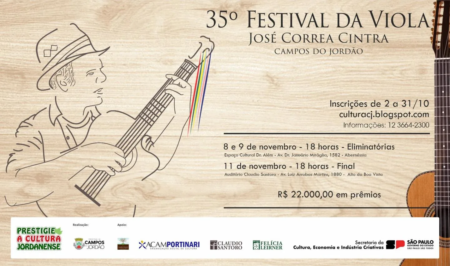 Neste ano, o valor da premiação é recorde: no total, os participantes concorrerão a 22 mil reais distribuídos para apresentações individuais e em duplas. O festival será realizado em dois lugares: nos dias 08 e 09 de novembro acontecem as eliminatórias no Espaço Cultural Dr Além. Já a grande final será realizada no dia 11, sábado, no Auditório Claudio Santoro, parceiro do projeto. Todas as apresentações são gratuitas.O Festival da Viola de Campos do Jordão é um dos mais tradicionais festivais da cidade e pioneiro na região, inspirando a realização de inúmeros outros festivais de música de raiz no Vale do Paraíba. Por essa razão, foi tombado como Patrimônio Imaterial da Cidade. Não perca a chance de participar! Os interessados podem se inscrever e acessar o regulamento por meio do site culturacj.blogspot.com. Mas lembre-se, as inscrições encerram no dia 31 de outubro. Para outras informações, entre em contato com a Secretaria de Valorização da Cultura: (12) 3664-2300.