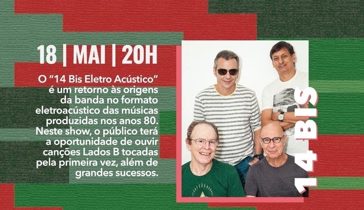 O “14 Bis Eletro Acústico” celebra os 45 anos de carreira da 14 Bis, como um retorno às origens da banda no formato eletroacústico das músicas produzidas nos anos 80. Neste show, o público terá a oportunidade de ouvir sucessos como “Todo Azul do Mar”, “Caçador de Mim” e “Canção da América”, além de Lados B tocados pela primeira vez e lançamentos recentes como “Sonhando o Futuro”.Uma oportunidade única de prestigiar uma das bandas mais importantes do rock nacional!Classificação livre