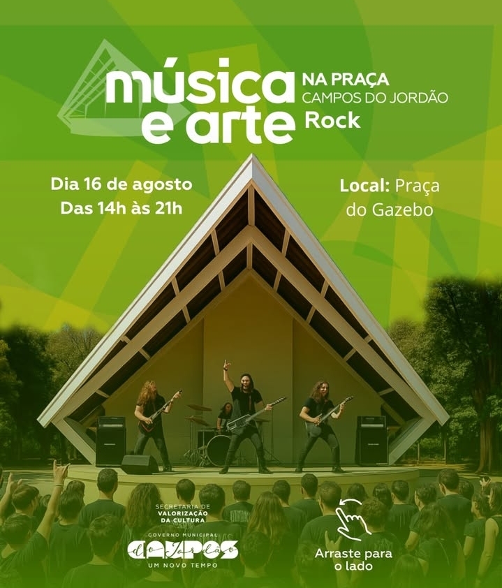 No dia 16 de agosto, das 14h ás 21h, vem curtir o Música e Arte na Praça com um line-up especial só de bandas de Campos do Jordão.Programação:15h30 - Rota do rock16h45 - Os Jonjos18h - Rádio Star19h - Alquimistas Sonorus20h - Vintage Vortex