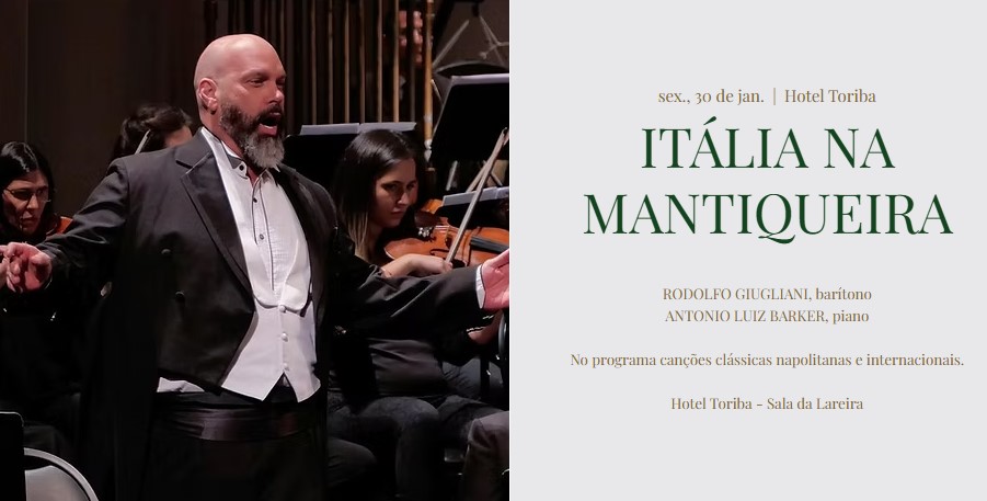 RODOLFO GIUGLIANI, barítono ANTONIO LUIZ BARKER, piano No programa canções clássicas napolitanas e internacionais. Hotel Toriba - Sala da Lareira30 de jan. de 2026, 19:00 – 20:30