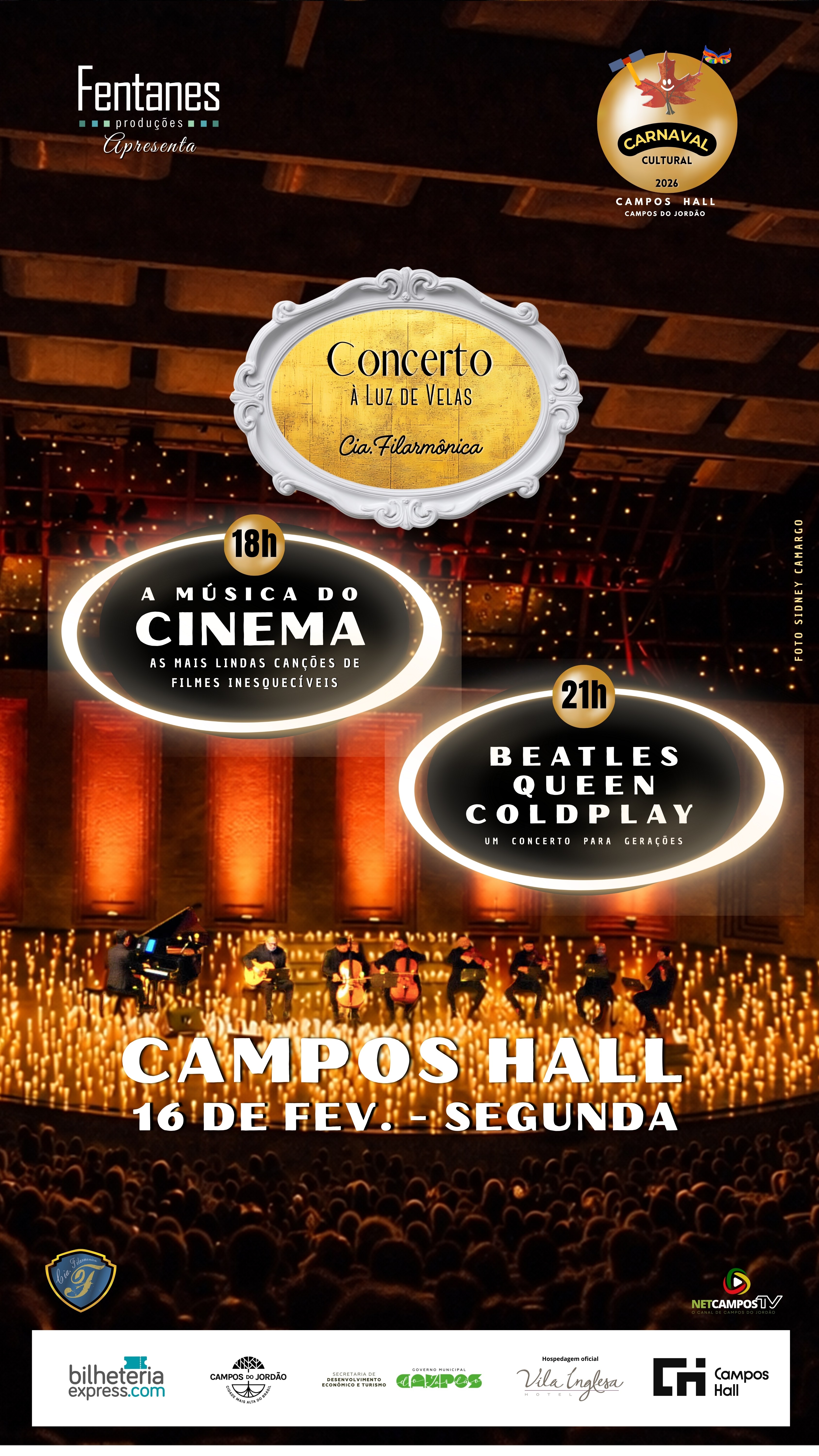 A Cia Filarmônica apresenta dois concertos imperdíveis no Campos Hall, em Campos do Jordão (SP), como parte do Carnaval Cultural 2026.16 de fevereiro de 2026 – 18hA Música do Cinema – Um concerto à luz de velas com as mais belas trilhas sonoras do cinema, interpretadas com sensibilidade e técnica pela Camerata da Cia Filarmônica. 16 de fevereiro de 2026 – 21hUm Concerto para Gerações – Clássicos dos Beatles, Queen e Coldplay em arranjos camerísticos que unem diferentes eras da música pop. Local: Campos Hall – Av. Macedo Soares, 499, Capivari, Campos do Jordão (SP)Av. Macedo Soares, 499 - Capivari, Campos do Jordão - SP, 12460-000