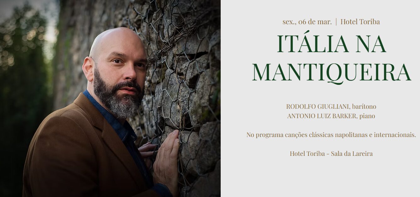 RODOLFO GIUGLIANI, barítono ANTONIO LUIZ BARKER, piano No programa canções clássicas napolitanas e internacionais. Hotel Toriba - Sala da Lareira06 de mar. de 2026, 19:00 – 20:30