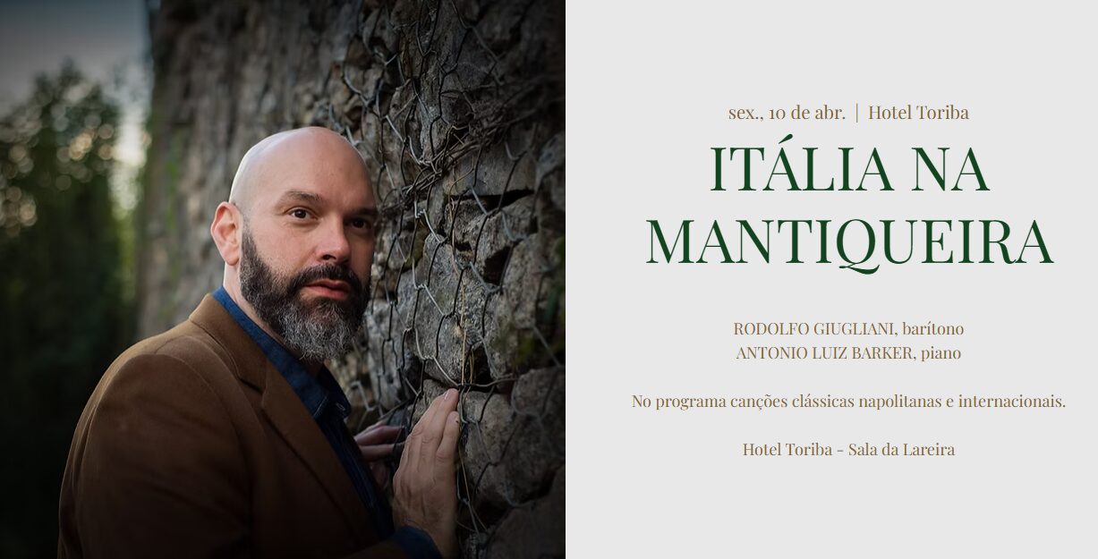 A programação musical do Hotel Toriba, sob a DIREÇÃO ARTÍSTICA DE ANTONIO LUIZ BARKER, é cuidadosamente preparada para enobrecer essa belíssima arte e presentear os nossos hóspedes com repertórios diversos como: piano clássico, jazz, recital de canto, música lírica, árias de ópera, música brasileira, bossa nova, e muito mais. As apresentações são gratuitas para os hóspedes do Toriba. Para visitantes está disponível na página Programação TM - Programação TM | Toriba Musical - a compra de ingressos ao valor de R$ 100,00 (cem reais) por apresentação.RODOLFO GIUGLIANI, barítono ANTONIO LUIZ BARKER, piano No programa canções clássicas napolitanas e internacionais. Hotel Toriba - Sala da Lareira