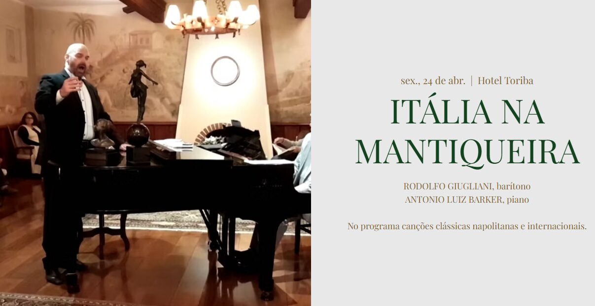 A programação musical do Hotel Toriba, sob a DIREÇÃO ARTÍSTICA DE ANTONIO LUIZ BARKER, é cuidadosamente preparada para enobrecer essa belíssima arte e presentear os nossos hóspedes com repertórios diversos como: piano clássico, jazz, recital de canto, música lírica, árias de ópera, música brasileira, bossa nova, e muito mais. As apresentações são gratuitas para os hóspedes do Toriba. Para visitantes está disponível na página Programação TM - Programação TM | Toriba Musical - a compra de ingressos ao valor de R$ 100,00 (cem reais) por apresentação.RODOLFO GIUGLIANI, barítono ANTONIO LUIZ BARKER, piano No programa canções clássicas napolitanas e internacionais.