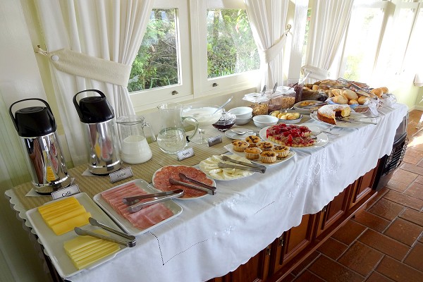 O café da manhã e chá tarde são apreciados em um salão com vista panorâmica para as montanhas.