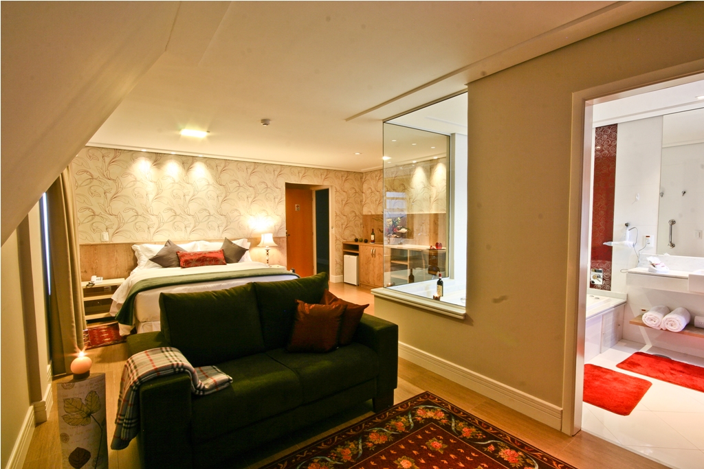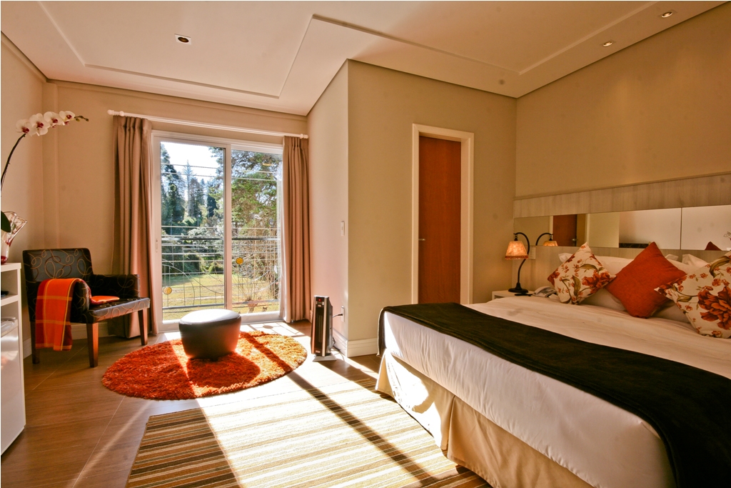 Primeiramente a pousada disponibiliza suítes luxo, super luxo com lareira, master com hidromassagem e a suíte Premium com lareira, hidro e uma pequena sala.