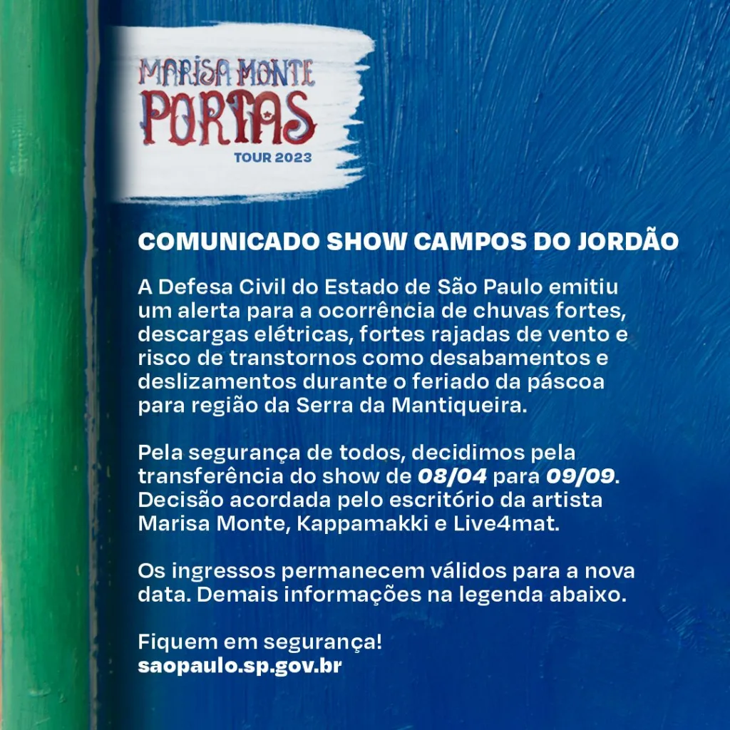 Previsto para acontecer no próximo dia 8 de abril em Campos do Jordão, o espetáculo da turnê Portas da cantora Marisa Monte, foi adiado devido ao alerta emitido pela Defesa Civil do Estado de São Paulo.