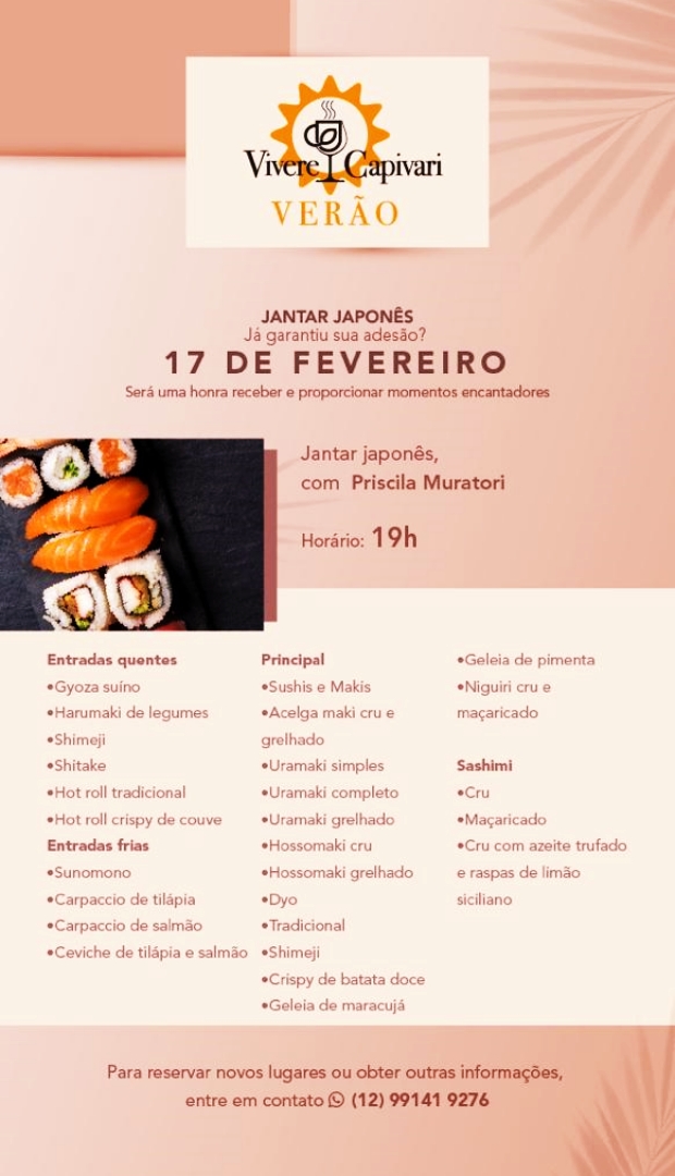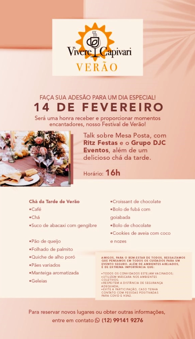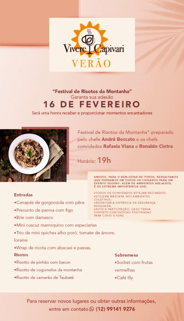 Jantares temáticos, vocação do Espaço Vivere Capivari, fecham a agenda nos dias 16 e 17. O evento segue todos os protocolos de segurança definidos pelo Ministério da Saúde e Governo do Estado de São Paulo.