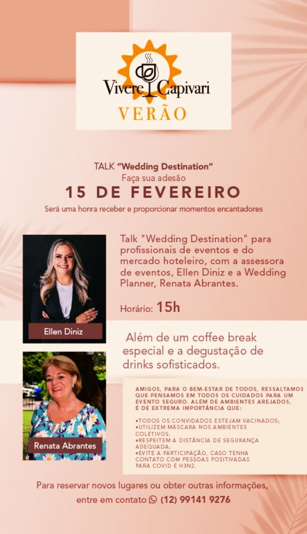 O bate-papo ocorre no dia 14 sobre mesa posta. No dia 15 será a vez de políticos locais, associação comercial, representantes do setor hoteleiro e formadores de opinião se unirem para entender as necessidades de Campos do Jordão como destination wedding. Neste dia, o evento será liderado pelas wedding planners Ellen Diniz e Renata Abrantes, com a presença de lideranças da Abrafesta (Associação Brasileira de Eventos) e Caes (Clube de Assessores e Organizadores de Eventos Sociais).