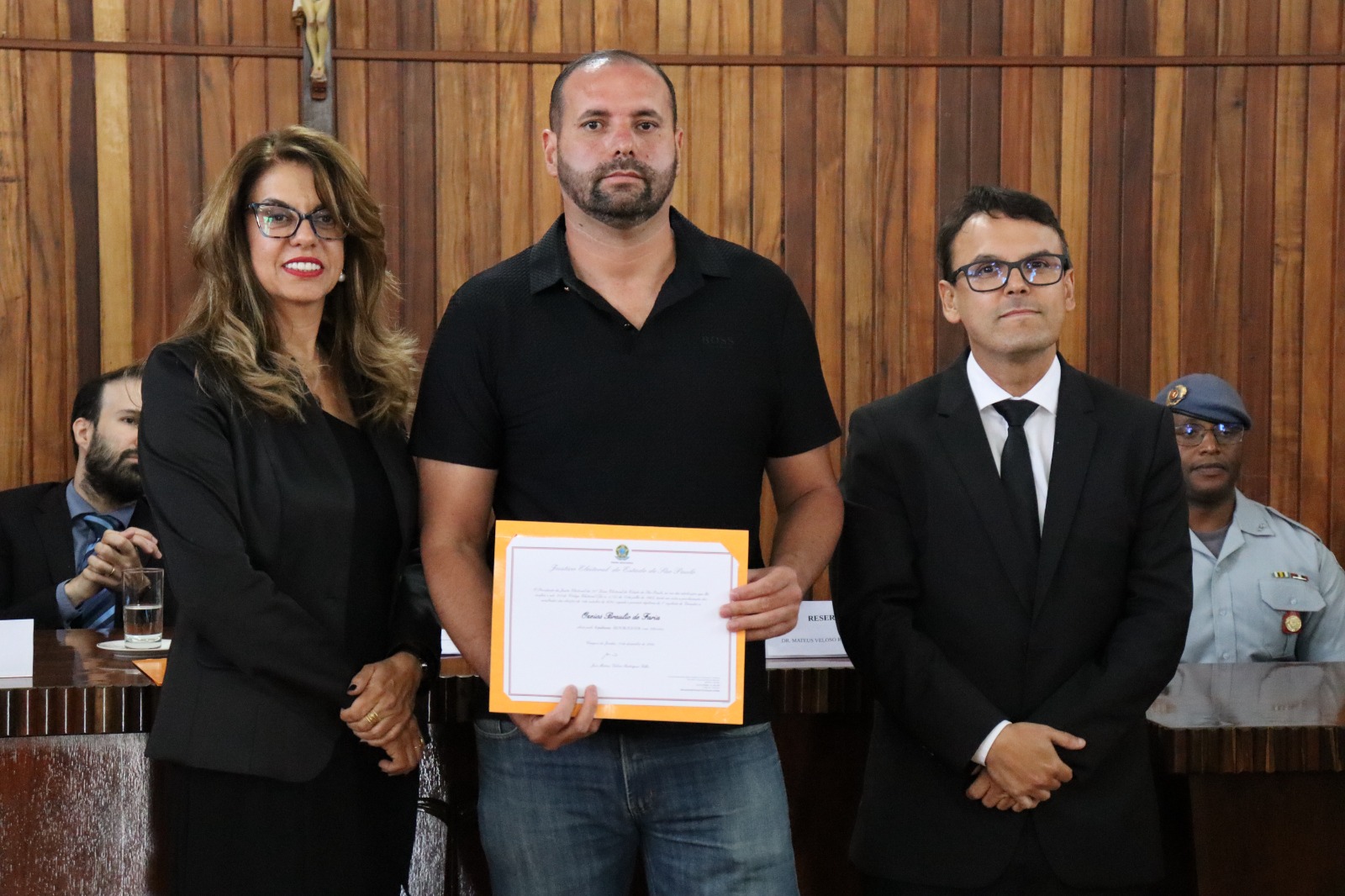 Carlos Eduardo Pereira da Silva (Republicanos) foi diplomado como prefeito, ao lado de Leandro Henrique Gonçalves César (União Brasil), vice-prefeito. Ambos destacaram, em suas falas, o compromisso com a gestão pública e o desejo de implementar projetos que atendam às necessidades da população.