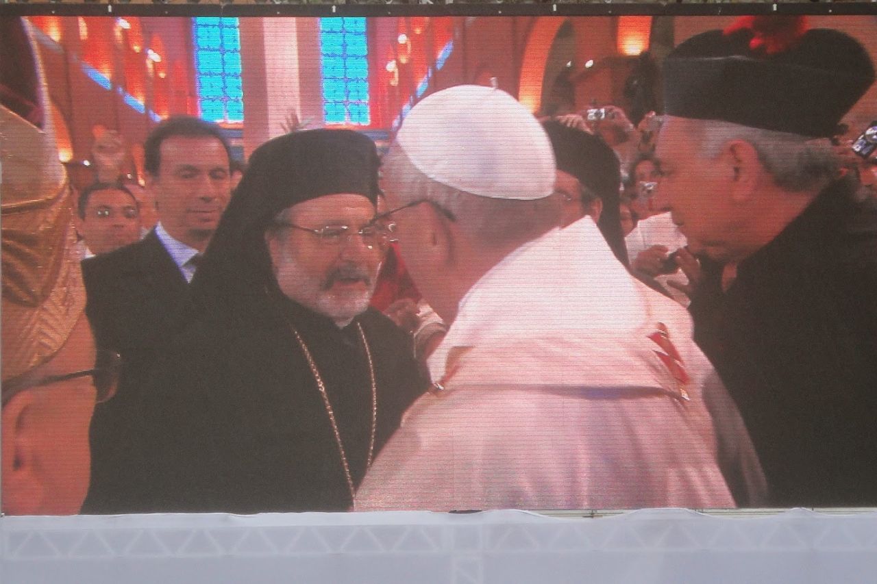 Francisco chegou no helicóptero do Exército e depois desfilou de papamóvel sem blindagem nas laterais saudando os fiéis que há dias aguardavam sua chegada no pátio da basílica. Os católicos não conseguiram conter a emoção ao vê-lo tão de perto, muitos choravam e gritavam seu nome. Em retribuição, o Papa pediu para o veículo parar e chegou a abençoar e até a beijar algumas crianças.