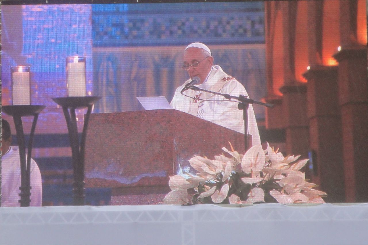 Cerca de 15 mil pessoas, incluindo devotos e convidados, puderam acompanhar a missa dentro da basílica. No final, Francisco se dirigiu até a Tribuna Bento XVI onde mais de 200 mil pessoas o aguardavam debaixo de chuva. Ele pediu desculpas por não falar português e em espanhol repetiu a frase que seria um marco em seu pontificado: "rezem por mim". Depois, deu a benção com uma imagem de Aparecida nas mãos e disse que voltaria em 2017, ano do Jubileu dos 300 anos do encontro da santa, o que não se confirmou.