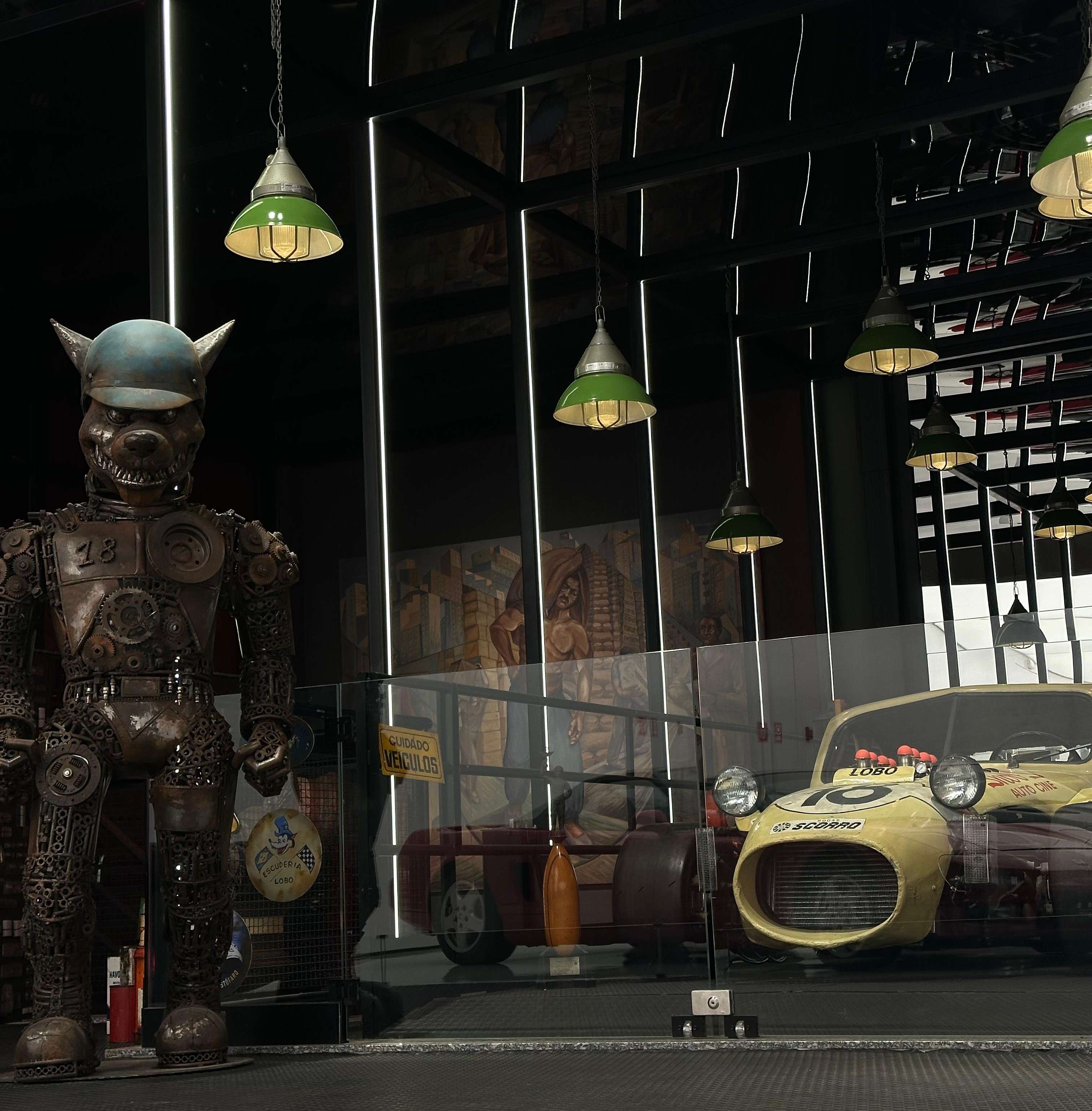O segundo espaço foi batizado de Oficina do Lobo Canindé, uma homenagem ao mecânico Camilo Cristófaro, que construiu a famosa carreteira. A escultura de um lobo representa o mecânico famoso no bairro Canindé, em São Paulo, e que conquistou admiração de gente famosa do automobilismo, como Wilson Fittipaldi. “A gente trouxe a emoção das pessoas que trabalharam com ele, da esposa, da família, dos sobrinhos. Ele foi muito audacioso para sua época”, explica o cenógrafo que assina o design do CARDE, Gringo Cardia.