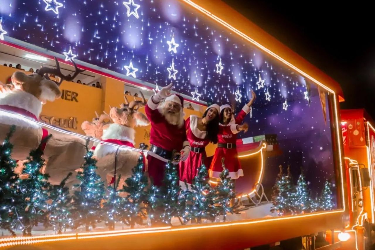 Os tradicionais caminhões vermelhos, decorados com milhares de luzes de LED, percorrem as ruas acompanhados por músicas natalinas, mensagens de esperança e personagens emblemáticos, como o Papai Noel e os famosos ursos polares da marca.