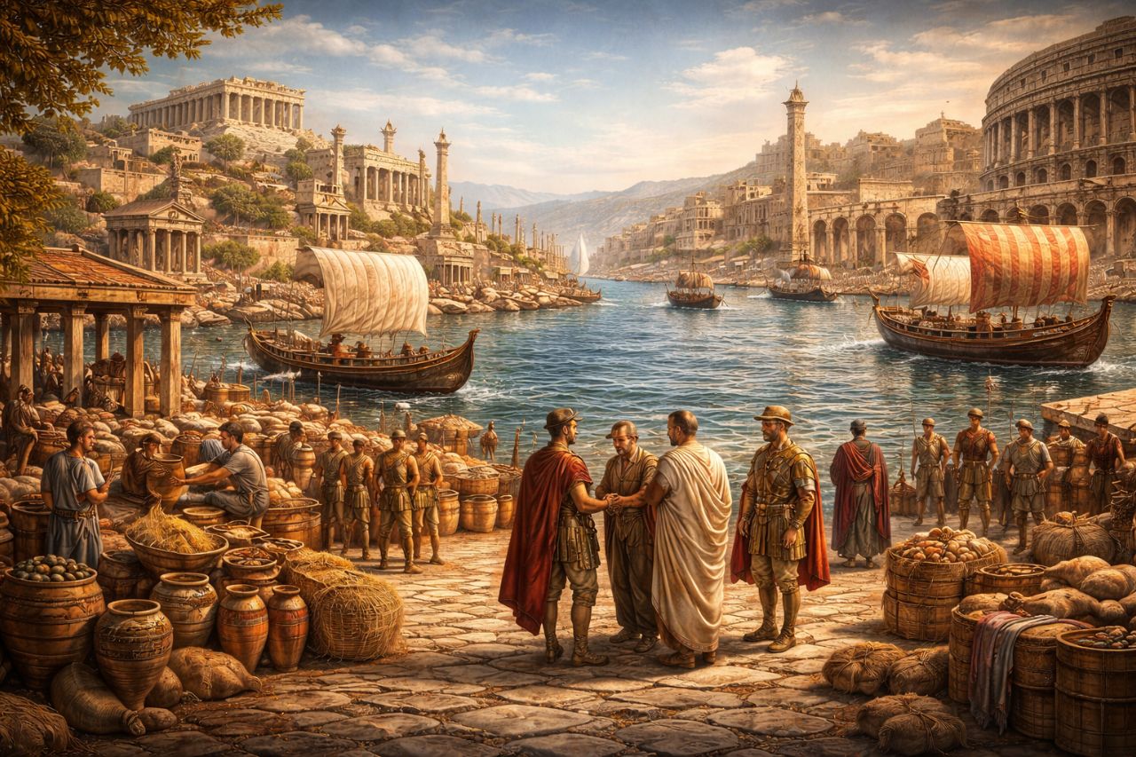 No mundo clássico, o Mediterrâneo vira um corredor econômico. A Grécia introduz linguagem política e debate público, mas continua dependente de hierarquias econômicas. Roma transforma domínio em sistema: estradas, portos, tributos, direito e cidadania como ferramentas de integração.