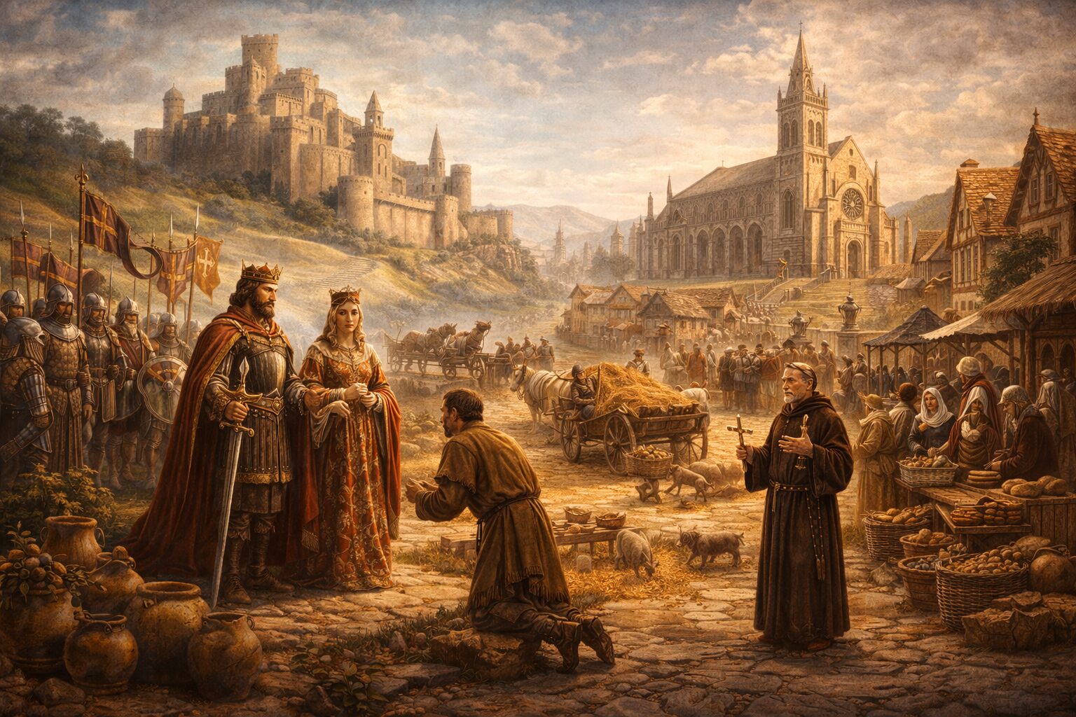 Após a fragmentação do Ocidente romano, a terra volta a dominar a economia e a política europeias. O feudalismo organiza proteção e produção como dependência. Instituições simbólicas sustentam a ordem social. Ao mesmo tempo, rotas mediterrâneas seguem relevantes e conectam a Europa a redes comerciais mais amplas.