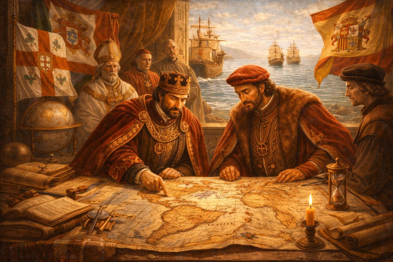 Quando o oceano vira estrada, o centro do mundo muda. Portugal e Espanha inauguram uma lógica que se tornaria global: território como ativo econômico. O Tratado de Tordesilhas simboliza a transformação do mapa em instrumento jurídico: divisão territorial por documento, não apenas por presença física.
