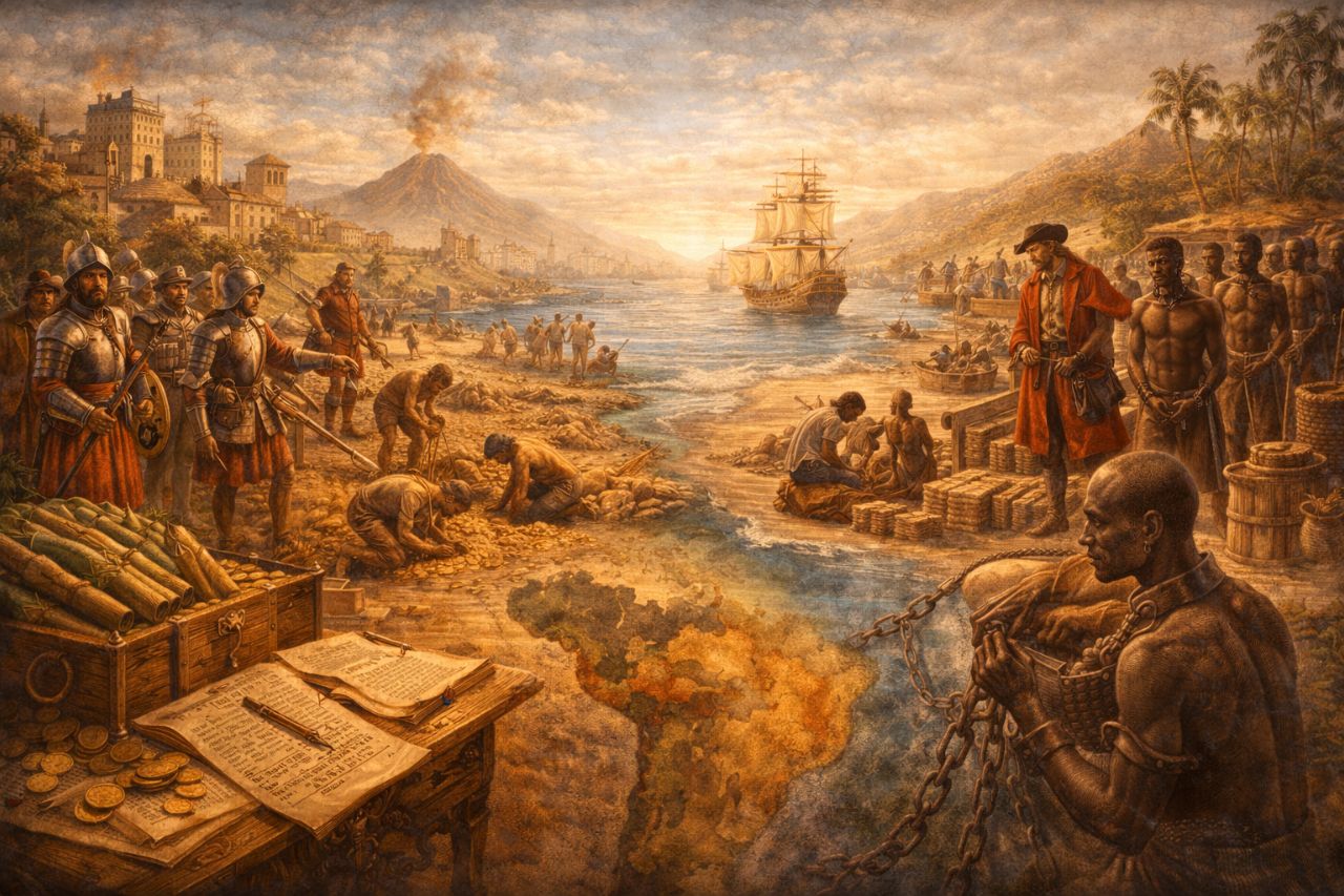 Nas Américas, a colonização reorganiza economias para exportação e mineração. Estruturas de concentração fundiária e desigualdade se consolidam. Em vários países, a independência política não elimina a dependência econômica. Muda o regime, mas permanecem circuitos de poder.
