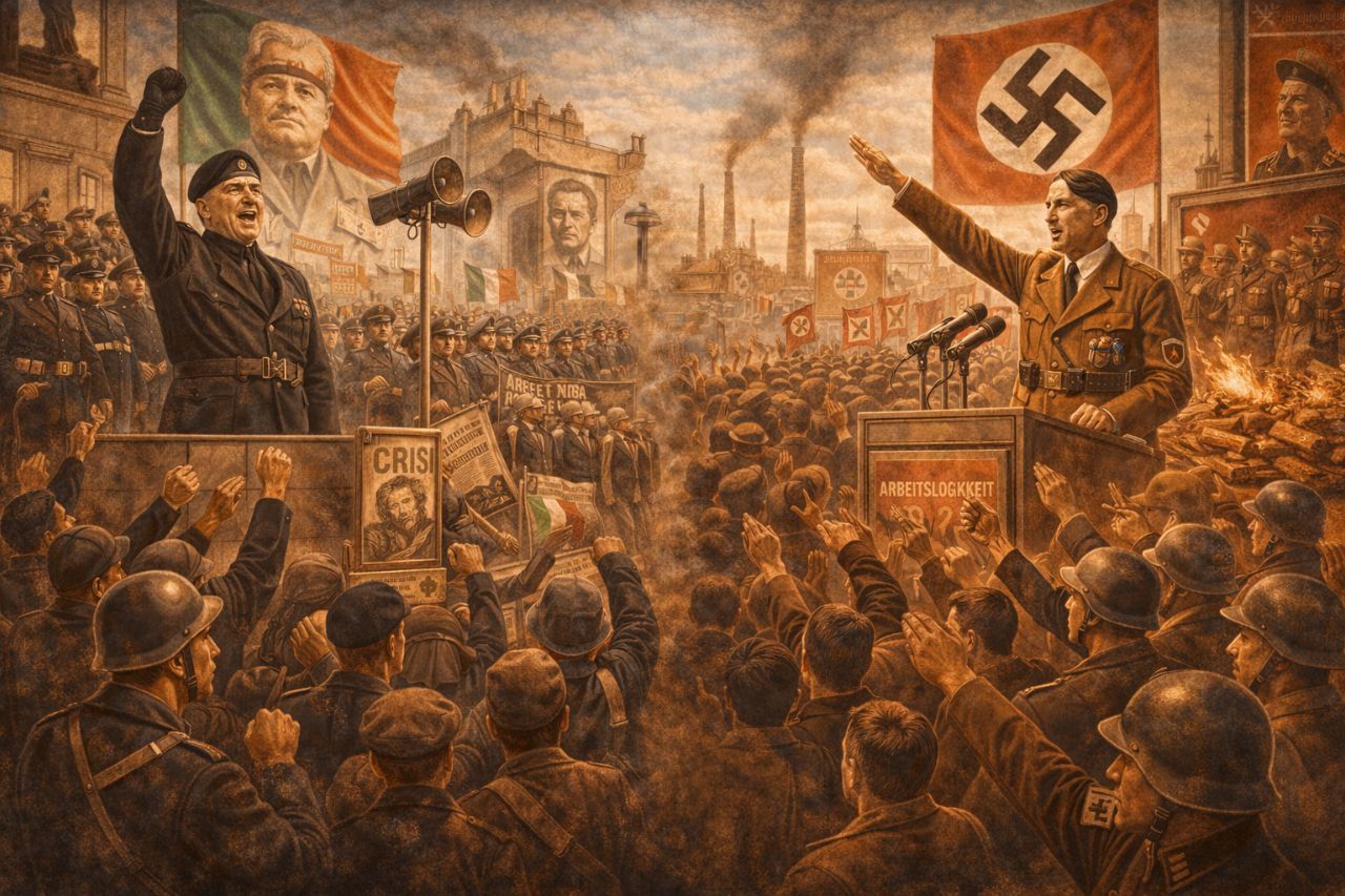 O entre-guerras é o laboratório da política de massa radical. Na Itália, o fascismo cresce como promessa de ordem e disciplina em meio a instabilidade. Na Alemanha, o nazismo ascende em ambiente de crise severa e ressentimento pós-guerra, sustentado por propaganda e controle cultural.