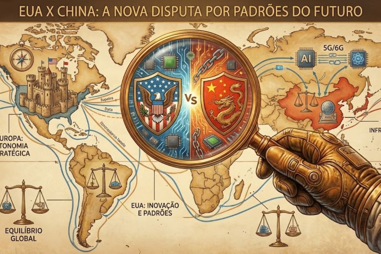 A rivalidade contemporânea entre Estados Unidos e China se organiza por tecnologia, dados, semicondutores, padrões e cadeias produtivas. Mais do que conquistar território, o objetivo é reduzir dependências e criar dependência nos outros. É uma disputa por regras do jogo: quem define padrão define mercado; quem define mercado define poder.