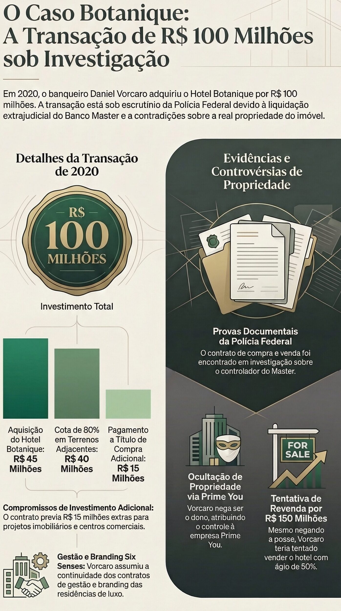 A Polícia Federal investiga a compra do hotel Botanique, um dos empreendimentos de luxo mais conhecidos de Campos do Jordão, após a descoberta de documentos que indicam a aquisição do empreendimento pelo banqueiro Daniel Vorcaro em 2020. O contrato de compra e venda, analisado pelos investigadores, aponta que a negociação teria alcançado o valor de R$ 100 milhões e integra o inquérito que apura atividades relacionadas ao executivo.