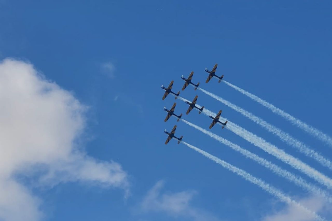 Durante 40 minutos, sete aviões A-29 Super Tucano fabricados pela Embraer riscaram o céu realizando cerca de 50 acrobacias. No Looping, os pilotos desafiaram as leis da física voando numa linha vertical até formar um círculo. Teve também o Lancevak , manobra em que ao avião sobe, gira em torno do próprio eixo e entra em Stall, ou seja, perde a sustentação e começa a cair até o piloto retomar a velocidade.