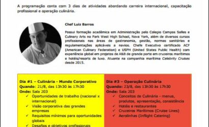 Entre os dias 21 e 23 de agosto, o Centro Universitário Senac Campus Campos do Jordão recebe o chefe internacional e executivo da SilverSea Cruzeiros, Luiz Barros, para o workshop de gastronomia em cruzeiro.A programação, que acontecerá das 13h 30 … Continua